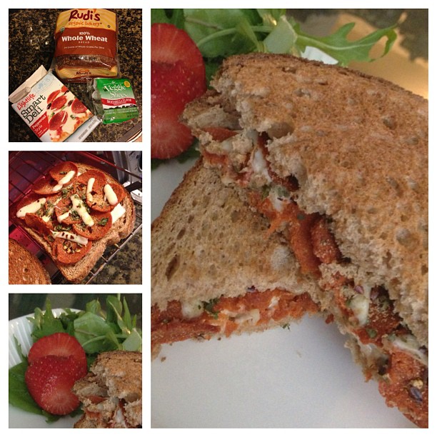My vegan pizza sandwiches are simple and easy to make. I personally like to use Rudi’s whole wheat bread with veggie “pepperoni” protein slices, and mozzarella flavored Veggie Slices. Add fresh garlic, basil, and oregano (or any fresh herbs you have on hand!). Voilà! A healthier alternative to calorie infested, fat-filled pizza. Pair it with an arugula salad with strawberries to balance the meal out with a touch of sweetness.