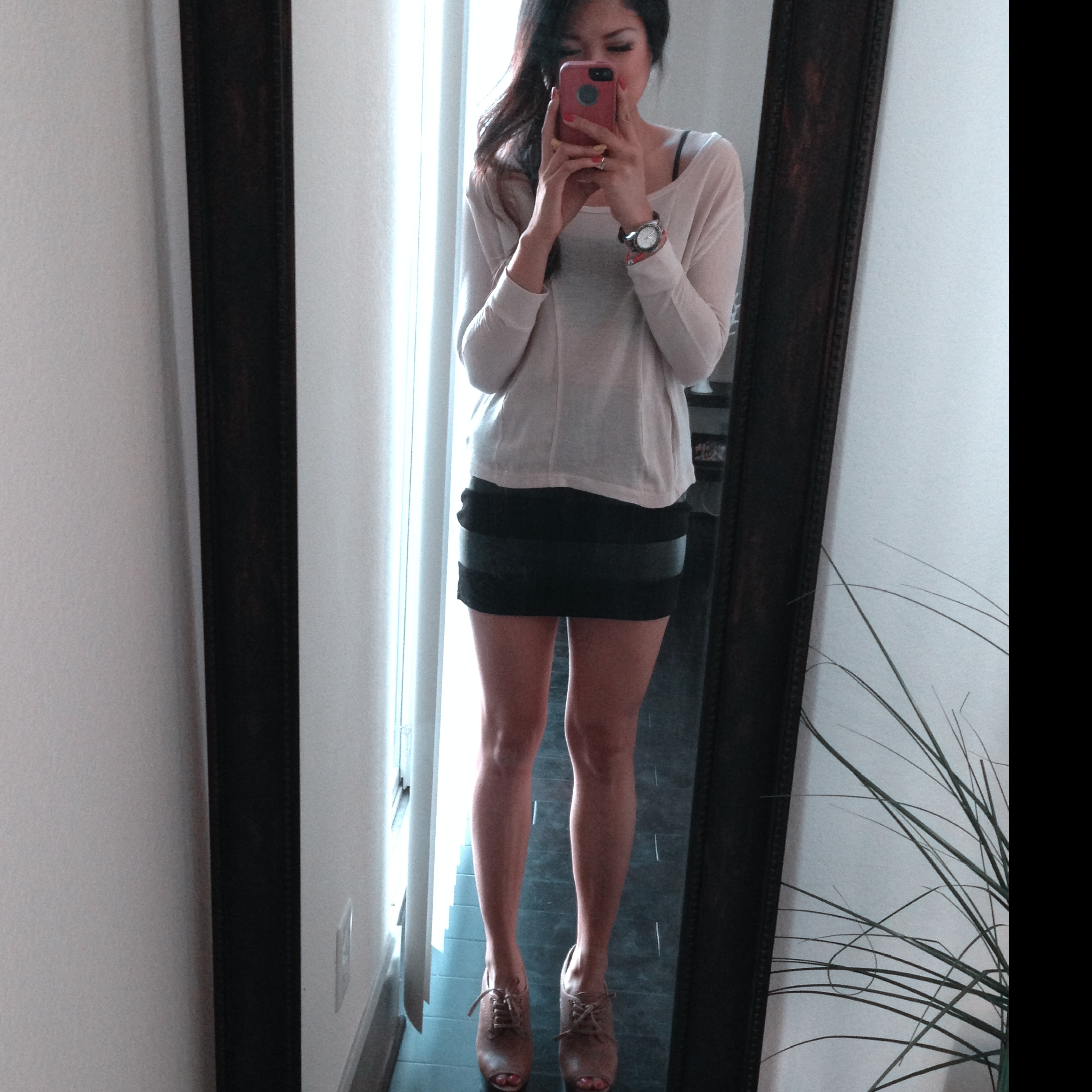 Trying to be a little edgy today so I threw on a leather mini skirt. Of course I had to make it a little girly by adding some pink and tan.