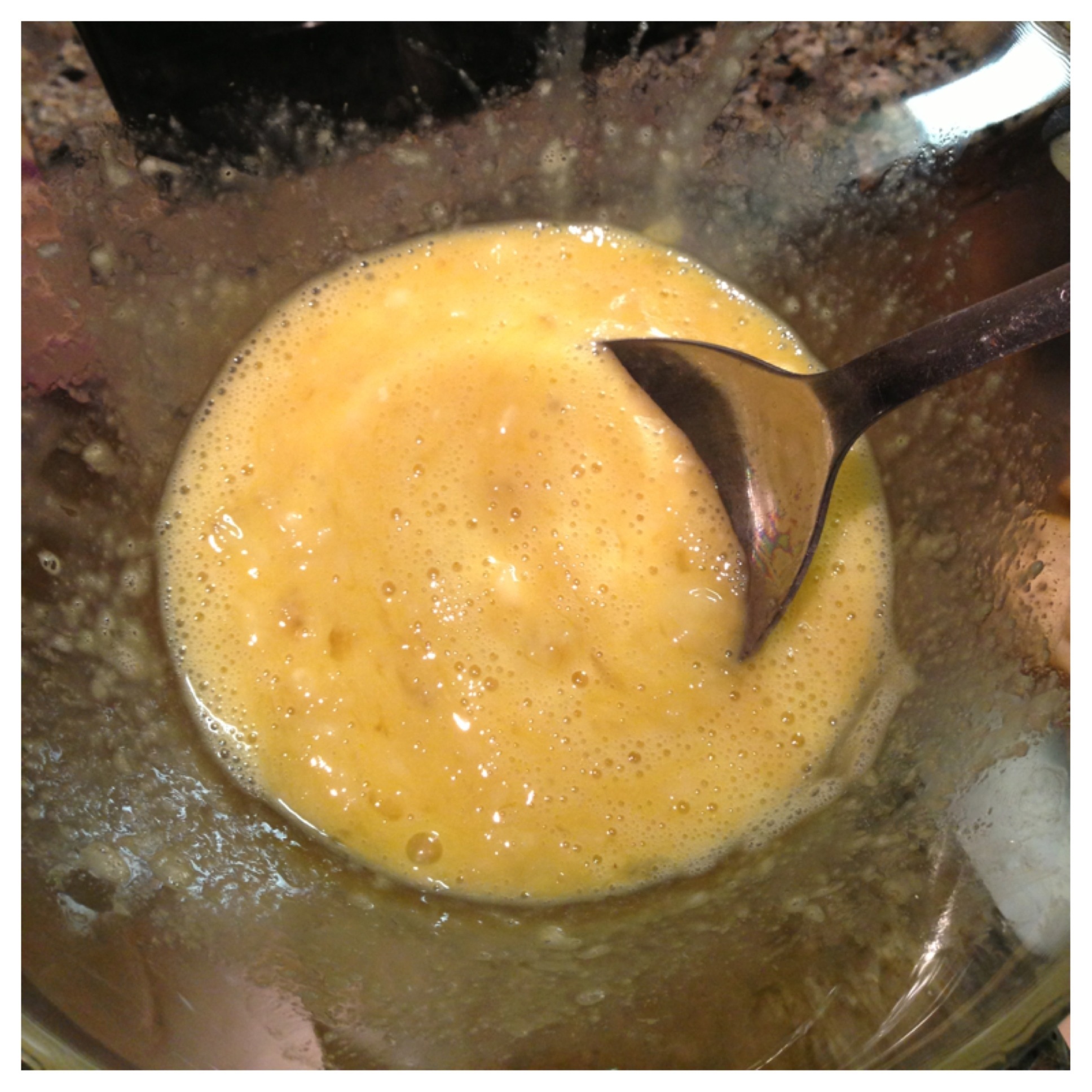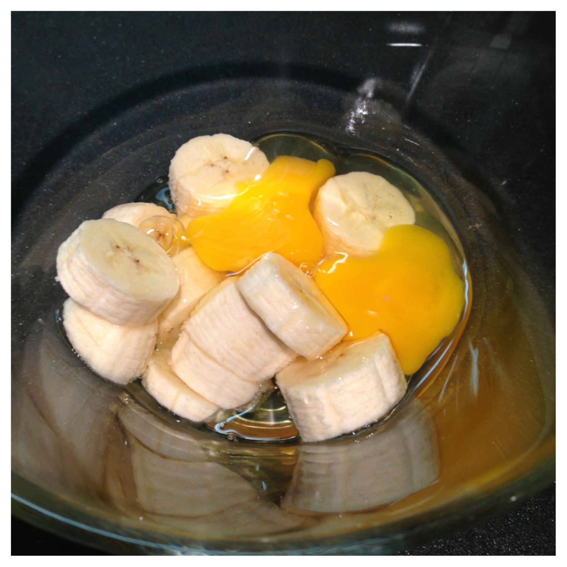 Yep, that’s it! Chop the bananas and crack two eggs in a bowl. Whisk/mash well until it gets frothy.