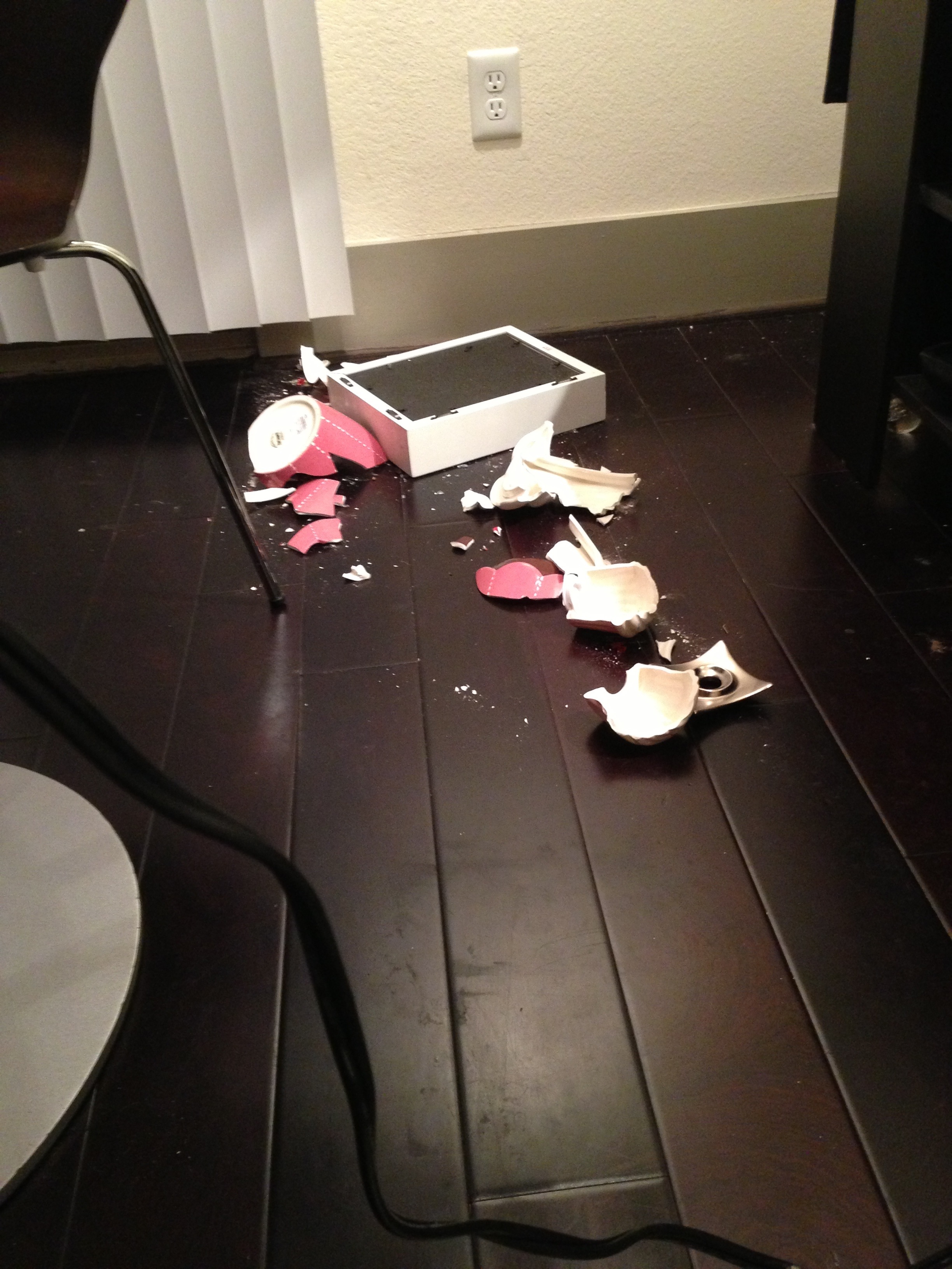 Cute right? Those sweet little brown eyes. So I left the house that night to have dinner with some friends down the street. I came home to find this: